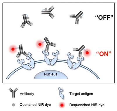 Schematic diagram of antigen-responsive antibody-fluorophore conjugates for activatable fluorescence imaging of cancer cells. NIR fluorescence of the conjugates stays off at normal tissues and in the extracellular region, but becomes highly fluorescent immediately after binding to the target antigens overexpressed on the cancer cell surface.