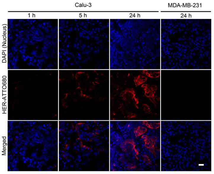 To find out the intratumoral microdistribution of targeted agents, finally, tumors were collected at each time point over the period of time after an intravenous injection of HER-ATTO680. Both Calu-3 and MDA-MB-231 tumors were resected and immersed into OCT compound to be sectioned at 7 µm thickness. After DAPI staining of nuclei, fluorescence images of tumorous tissues were acquired using a confocal scanning laser microscope (λex 633 nm and λem 647-754 nm for HER-ATTO680; λex = 405 nm and λem 420-480 nm for DAPI). As shown in Figure 6, a time-dependent increase in NIR fluorescence was observed in Calu-3 tumor sections, whereas no measureable fluorescence was observed in the MDA-MB-231 tissue. This result confirms that HER-ATTO680 accumulated in the tumor site after prolonged systemic circulation by the enhanced permeation and retention (EPR) effect, and thus real-time NIR fluorescence imaging was enabled.