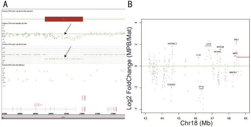 (A) A 122kb chromosome 18q21.1 deletion (Chr 18: 46,888,182-47,010,397) was detected by CytoScanTM HD array. The log 2-based test/reference intensity ratios of DNA clones located on chromosome 18 were below -0.5 (black arrow)—the position of the 18q21.1 deletion within the DYM gene. (B) A picture is demonstrated that the distribution of genetic CNVs surrounding DYM gene in chromosome 18. The log 2-based maternal peripheral blood sample (MPB)/maternal independent sample (Mat) ratio was calculated; >0 means genetic duplication and <0 means deletion. The gene which has a high grey spots coverage part means a high false positive rate.