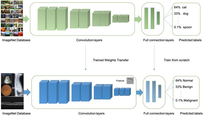 At present, there are at least four limitations in AI technology that is based on machine learning, First, most machine learning methods have too few training sets and verification sets. More image data training is needed to further improve accuracy, sensitivity, and specificity. Transfer learning is an approach is more suitable when limited training data is available for the problem under consideration. In transfer learning, one can learn a complex model using data from a source domain where large-scale annotated images are available (e.g. natural images). Then, the model is further fine-tuned with data of the target domain where only a small number of annotated images are available (e.g. medical images) [66] (Fig 3).