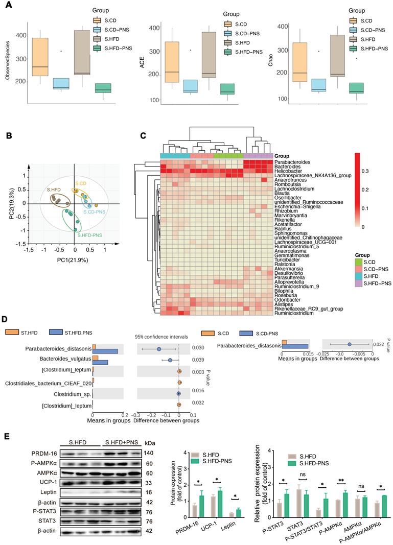 The gut microbiota alterations associated with leptin activation contributed to the effects of PNSs. (A) Box plot of the α diversity of the S.CD (n = 5), S.CD-PNS (n = 4), S.HFD (n = 5) and S.HFD-PNS (n = 5) groups. (B) PCA plots of the β diversity of the S.CD, S.CD-PNS, S.HFD and S.HFD-PNS groups. (C) Hierarchical clustering of the bacterial phyla in the S.CD, S.CD-PNS, S.HFD and S.HFD-PNS groups. (D) Different analyses at the bacterial species level between the untreated and PNS-treated groups. (E) Western blot analyses of the PRDM-16, leptin, STAT3, and AMPKα protein levels and the phosphorylated STAT3 and AMPKα protein levels in S-WAT of the S.HFD and S.HFD-PNS groups. β-actin was used as a loading control.