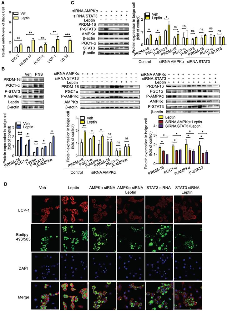 Leptin activation was dependent on the AMPKα/STAT3 pathway. (A) Relative mRNA expression of the BAT markers UCP-1, PGC1α, PRDM-16, DIO-2, and CD36 in differentiated C3H10T1/2 cells treated with vehicle, leptin or PNS. (B) Western blot analyses of PRDM-16, PGC1α, leptin, and phosphorylated STAT3 and AMPKα protein levels in differentiated C3H10T1/2 cells. β-actin was used as a loading control. (C) The efficiency of the siRNA-mediated depletion of AMPKα and STAT3 in beige cells treated with leptin was determined by immunoblotting. (D) Representative fluorescence images showing the expression of UCP-1 (red) and the status of lipid droplets stained with BODIPY 493/503 (green) in the siRNA-treated cells after induction. Scale bar: 20 µm.