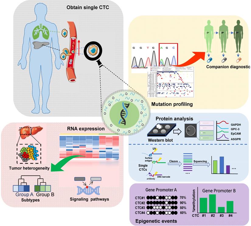 Schematic representation of single-cell analysis of CTCs in HCC: Genomic, transcriptomic, proteomic, and epigenetic analyses are included. In the genomic analysis, tumor-related gene mutations are analyzed for companion diagnostics. In the transcriptome analysis, RNA levels are analyzed to assess tumor heterogeneity, identify tumor cell subsets, and dissect signaling pathways related to chemo-resistance. The epigenetic and proteomic analyses offer additional information about tumor heterogeneity.