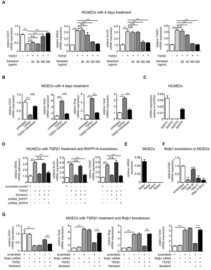 Serelaxin partially inhibits TGFβ1-induced EndMT in human coronary artery endothelial cells (HCAECs) and mouse cardiac endothelial cells (MCECs) via RXFP1. (A) qPCR analysis showing the expression of endothelial cells marker CD31 and expression of EndMT key regulators SNAIL, SLUG, and TWIST in TGFβ1-treated HCAECs supplemented with different doses of Serelaxin after 4 days. Cells without any treatment were used as control. Serelaxin treatment significantly rescued expression of CD31 (100 and 200 ng/ml) and decreased expression of SNAIL, SLUG and TWIST (100 and 200 ng/ml). (B) qPCR analysis showing the mRNA expression of EndMT transcriptional factors Snail, Slug and Twist and of endothelial cell marker CD31 in TGFβ1-treated MCECs. Upon TGFβ1 treatment Snail, Slug and Twist expression increased and CD31 expression decreased. Treatment of Serelaxin showed a reduced expression of Snail, Slug and Twist and a restored expression of CD31. (C) qPCR analysis showing the relative mRNA expression level of RXFP1-4 in HCAECs. Among all four genes, only RXFP1 and RXFP4 expression was detectable. (D) qPCR analysis showing the expression of EndMT key regulators SNAIL, SLUG and TWIST in TGFβ1 and Serelaxin-treated HCAECs in combination with knockdown of RXFP1 or RXFP4. Cells without any treatment were used as control. Serelaxin treatment showed a reversal effect on TGFβ1-induced EndMT but not in RXFP1 knockdown cells. (E) qPCR analysis showing the relative mRNA expression level of Rxfp1-4 in MCECs. Among all 4 genes, only Rxfp1 expression was detectable but not the others. (F) qPCR analysis showing the relative mRNA level of Rxfp1 in scrambled and siRNA-mediated Rxfp1 knockdown cells. (G) qPCR analysis showing the expression of EndMT key regulators Snail, Slug and Twist in TGFβ1 and Serelaxin-treated MCECs upon Rxfp1 knockdown. Cells without any treatment were used as control. Serelaxin treatment showed a reversal effect on TGFβ1-induced EndMT but not upon Rxfp1 knockdown. Student t-test was used for single comparison and one-way ANOVA with Bonferroni post-hoc analysis was used for multiple group comparisons. Gene expression and associated error bars represent mean ± SEM, n≥3, n.s. no significance, * p<0.05, ** p<0.01, *** p<0.001.