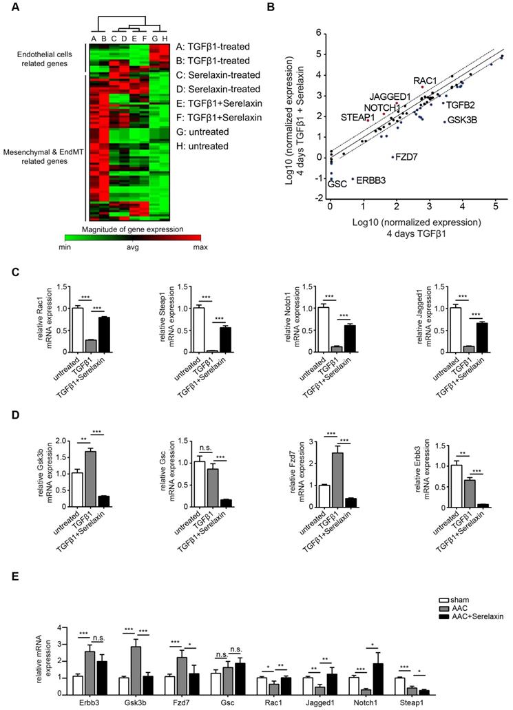 Serelaxin promotes the preservation of endothelial cell properties in both in vivo and in vitro by regulating candidate genes. (A) Heat map and (B) scatter plot show the genes with altered mRNA expression level in only TGFβ1-treated (x-axis) or in both TGFβ1- and Serelaxin-treated (y-axis) HCAECs. STEAP1, NOTCH1, JAGGED1, RAC1, DSP, GSC, ERBB3, FZD7, GSK3B and TGFB2 were significantly regulated by Serelaxin treatment, which is shown by separation from dot lines (cut-off by 4 folds). (C-D) qPCR analysis showing the expression of candidate genes, which were identified from qPCR array in TGFβ1- and Serelaxin-treated MCECs. Cells without any treatment were used as control. (E) qPCR analysis of the panel of candidate genes in vivo in sham and AAC-operated mice treated with vehicle or Serelaxin. Serelaxin significantly rescued the effects of AAC on all genes except for Gsc and Steap1. Student t-test was used for single comparison and one-way ANOVA with Bonferroni post-hoc analysis was used for multiple group comparisons. Gene expression and associated error bars, representing mean ± SEM n≥3, n.s. no significance, * p<0.05, ** p<0.01, *** p<0.001.