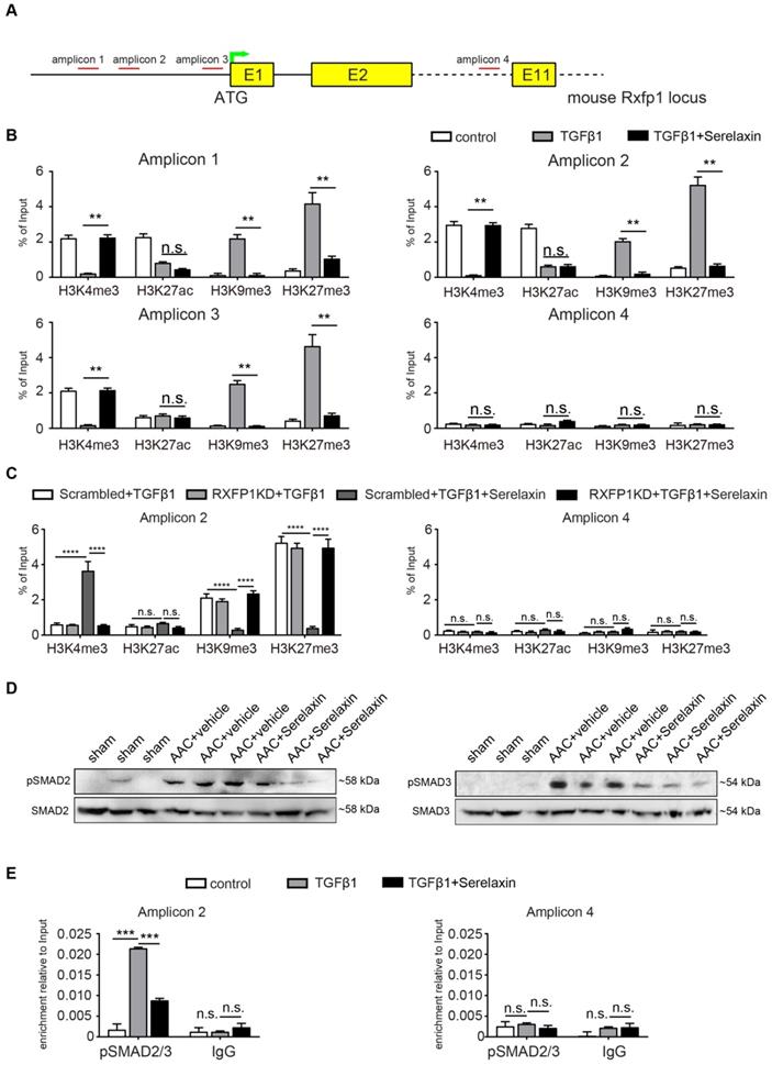 Serelaxin reactivates Rxfp1 expression via histone modifications. (A) Schematic representing the mouse Rxfp1 locus with locations of CHIP-qPCR primers. (B) qPCR analysis showing the enrichment of 4 different histone modification marks (active: H3K4me3 and H3K27ac, repressive: H3K9me3, H3K27me3) in the Rxfp1 promoter region (Amplicon 1-3) and intron 10 (Amplicon 4). The enrichment of TGFβ1-influenced H3K4me3, H3K9me3 and H3K27me3 marks were significantly compromised by Serelaxin if performed with amplicons 1-3 targeting the promoter region but not with amplicon 4 targeting intron10. (C) ChIP-qPCR analysis showing the enrichment of histone modification marks in the Rxfp1 promoter region after RXFP1 knockdown. Upon RXFP1 knockdown, treatment with Serelaxin did not significantly increase the activating modifications or decrease the repressive modification marks. (D) Western blot analysis showing protein levels of pSMAD2 and pSMAD3 in sham, AAC-operated and AAC-operated+Serelaxin-treated mouse hearts, total SMAD2 and SMAD3 were used as protein loading controls. AAC-operated hearts showed increased levels of pSMAD2 and pSMAD3 compared to sham. Upon treatment with Serelaxin these protein levels were significantly reduced. (E) qPCR analysis showing the enrichment of pSMAD2/3 in the Rxfp1 promoter region (Amplicon 2) and intron 10 (Amplicon 4). The enrichment of TGFβ1-induced pSMAD2/3 was significantly compromised by Serelaxin. The qPCR analysis with primer targeting intron10 did not show any significant differences between these groups. Student t-test was used for single comparison and one-way ANOVA with Bonferroni post-hoc analysis was used for multiple group comparisons. Gene expression and associated error bars, representing mean ± SEM, n≥3, n.s. no significance, ** p<0.01, *** p<0.001, **** p<0.0001.