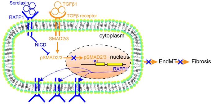 Conclusions: This study is the first to identify that Serelaxin increases the expression of its own receptor RXFP1 and that this mediates the inhibition of EndMT and cardiac fibrosis, suggesting that Serelaxin may have a beneficial effect as anti-fibrotic therapy in chronic heart failure.