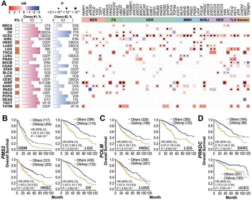 DDR gene amplification in the tumor correlates with poor patient survival and drug resistance. A) Tumor patients with specific DDR gene CNAmps (GISTIC calls = 1 and 2) showed poor overall survival compared to the rest of the patients by the Cox regression model. The radiotherapy and chemotherapy background of each cancer type is shown in the left panel. RTx: radiotherapy; Yellow: radiotherapy is commonly applied. Chemo #1, Chemo #2: the top 2 commonly used chemotherapy agents; percentage of patients that received each agent is indicated by the bar chart. CTX: Cyclophosphamide; DOX: Doxorubicin; TMZ: Temozolomide; BVZ: Bevacizumab; CBDCA: Carboplatin; PTX: Paclitaxel; SU11248: Sunitinib; IFNA: Interferon A; CDDP: Cisplatin; T4: Levothyroxine; T3: Liothyronine; LEUP: Leuprolide; CDX: Bicalutamide; DTIC: Dacarbazine; 5-FU: Fluorouracil; FOL: Leucovorin; GCB: Gemcitabine; SRF: Sorafenib; CCI-779: Temsirolimus; CAPE: Capecitabine; VCR: Vincristine; VP-16: Etoposide. Right panel: Heat map; blue and red represent negative and positive hazard ratios, respectively and P-value is denoted by the dot size. DDR genes with CNAmp in over 35% of pan-cancer patients are presented here. B-D) PMS2 (B), POLM (C), and PRKDC (D) amplification is significantly associated with poor survival in multiple cancer types. Overall survival rates were estimated by Kaplan-Meier curves between patients with or without specific gene CNAmp and compared in the specific cancer types using a Cox regression model using the DDR gene SCNA score.