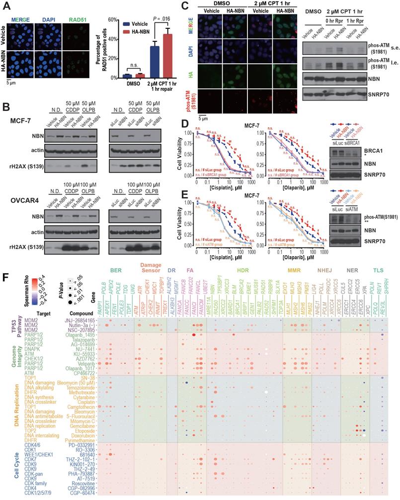 DDR gene amplification is associated with cell line drug resistance. A) NBN overexpression significantly (Student's t-test, P = 0.016) increases RAD51 foci formation after camptothecin (CPT) treatment in MCF-7 cells. B) NBN overexpression (or knockdown) decreases (or increases) the γH2AX expression after double-strand break drug treatment in MCF-7 and OVCAR4 cells. N.D.: no drug control; CDDP: cisplatin; OLPB: olaparib. C) NBN overexpression increases p-ATM (Ser1981) foci formation and phosphorylated protein expression after camptothecin treatment in MCF-7 cells. Rpr: drug-free repair in fresh medium. s.e.: short exposure. l.e.: long exposure. D) BRCA1 or ATM (E) knockdown rescues the NBN overexpression-induced cisplatin and olaparib resistance in MCF-7 cells (MTT assay). * non-specific band of BRCA1 antibody. ** non-specific band of p-ATM antibody. Cell viability data are presented as mean ± SEM (n = 3 for technical replicates). n.s.: not significant, #: P < 0.05, ##: P < 0.005. F) DDR gene copy number is highly associated with the in vitro response of drugs targeting genome-instability. The Spearman's rank correlations test was used to determine the correlation between the copy number alteration of each of the 80 core DDR genes and the log-transformed IC50 of the 37 genome-instability targeting drugs across the cancer cell lines. The color and size of each bubble indicate the Spearman's rank correlation coefficients and P-values, respectively.