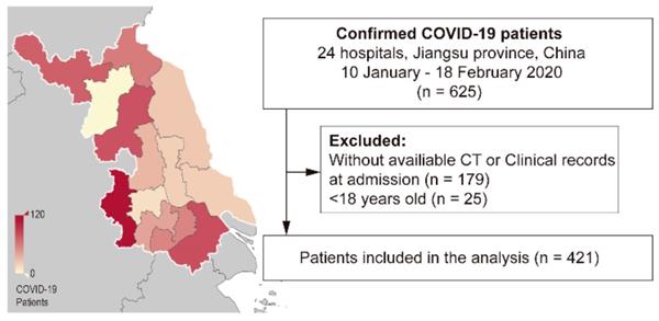 In this retrospective cohort study, we enrolled patients with laboratory-confirmed COVID-19 in Jiangsu province between 10 January and 18 February 2020. Laboratory confirmation was based on a positive result on high-throughput sequencing or real-time reverse-transcriptase-polymerase-chain-reaction (RT-PCR) assay of nasal and pharyngeal swab specimens [5]. We extracted clinical and initial CT findings at admission from electronic medical records in the Department of Health, Jiangsu province. We excluded patients aged < 18 years old or with missing clinical or CT records on admission (Figure 1).