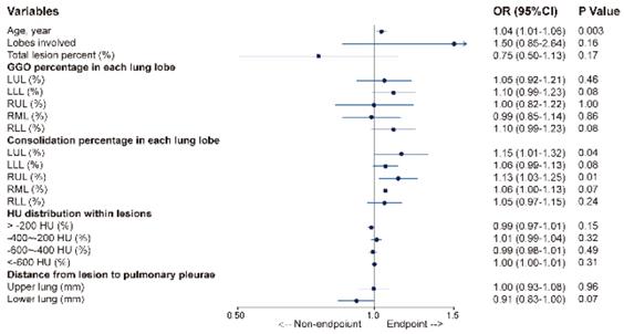 Finally, 359 patients with complete data (on age and 18 CT parameters) were included in the multivariable logistic regression model. As shown in Figure 3, older age (odds ratio [OR], 1.04; 95% confidence interval [CI: 1.01-1.06; P =0.003), larger consolidation lesions in the RUL (OR, 1.13; 95% CI: 1.03-1.25; P = 0.01) and LUL (OR, 1.15; 95% CI: 1.01-1.32; P =0.04) were associated with increased odds of endpoints.