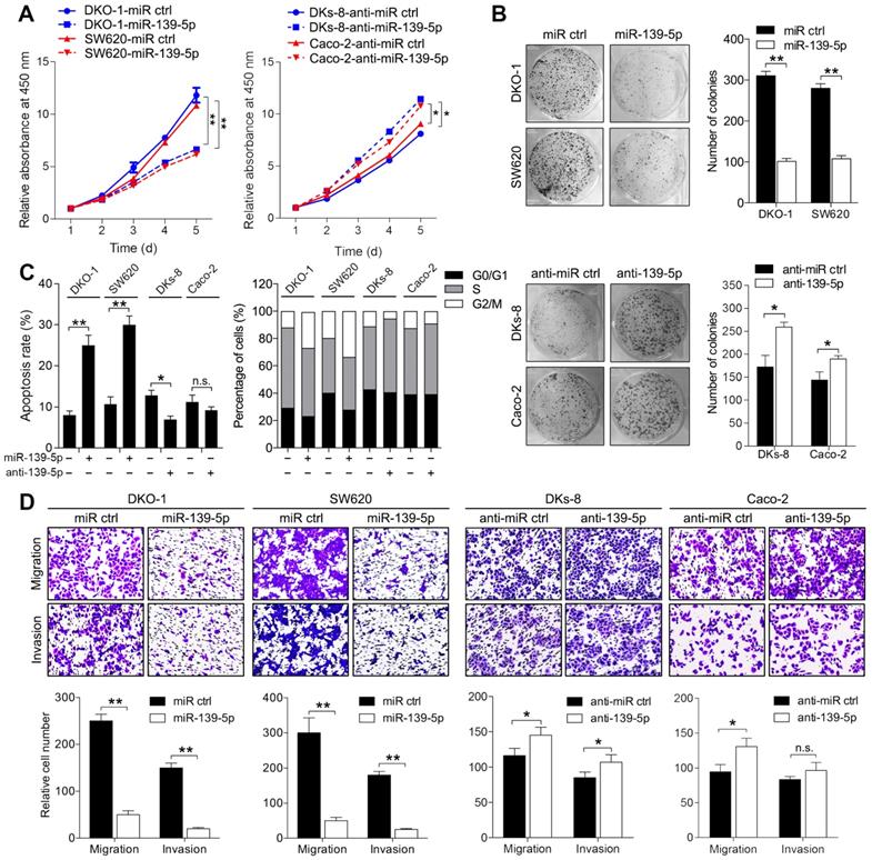 Methods: miR-139-5p was identified and evaluated by small RNA sequencing, qRT-PCR and in situ hybridization. The roles of miR-139-5p in CRC cells with and without KRAS mutation were determined by Cell Counting Kit-8 (CCK-8), colony formation, flow cytometry and transwell assays in vitro and by tumorigenesis and metastasis assays in vivo. Microarrays followed by bioinformatic analyses, luciferase reporter assays and Western blotting were applied for mechanistic studies.