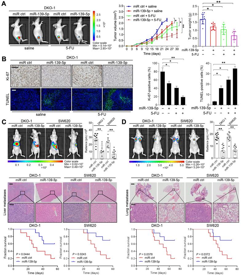 To extend the above findings to an in vivo setting, stable miR-139-5p-overexpressing DKO-1 and SW620 cells were established by lentivirus infection and then subcutaneously injected into the flanks of nude mice. Increased expression of miR-139-5p upon transfection was confirmed by real-time PCR (Supplementary Figure S1B). Tumor size and tumor weight were significantly lower in mice implanted with miR-139-5p-overexpressing cells than in control mice (Figure 3A and Supplementary Figure S1C-D). 5-FU, a standard chemotherapeutic agent for CRC treatment, was injected intraperitoneally after the tumor volume reached approximately 100 mm3. Treatment with 5-FU impaired tumor growth, and the inhibitory effect was more pronounced when miR-139-5p was overexpressed (Figure 3A and Supplementary Figure S1C-D). Furthermore, xenografts derived from miR-139-5p-overexpressing cells exhibited decreased proliferation and increased apoptosis, as evidenced by Ki-67 and TUNEL staining (Figure 3B and Supplementary Figure S1E).