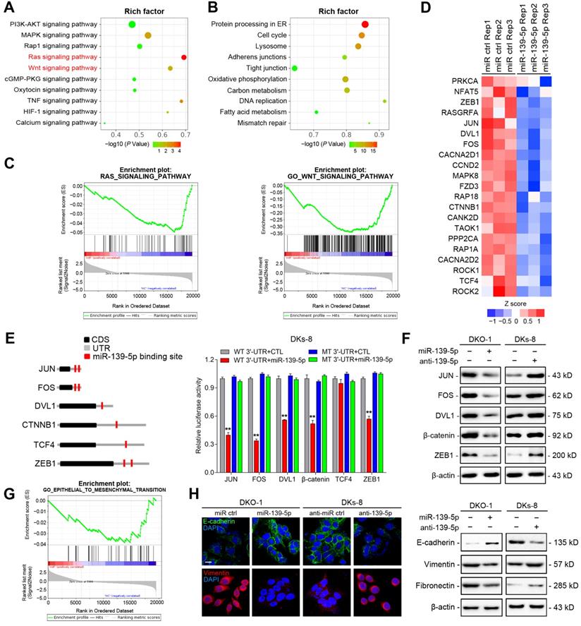 To identify functional targets of miR-139-5p in CRC, we performed gene expression microarray profiling in DKO-1 cells after miR-139-5p overexpression and identified 3878 differentially expressed genes (|log2(FC)|>1, P<0.01). KEGG analysis revealed that the Ras and Wnt signaling pathways were the most significantly affected pathways (Figure 4A). Biological process analysis suggested that miR-139-5p inhibited the cell cycle, focal adhesion and cellular adhesion (Figure 4B), consistent with our experimental results. GSEA revealed that the miR-139-5p-induced gene expression alterations were negatively associated with the KEGG Reactome terms 'RAS pathway' and 'Wnt signaling pathway' (Figure 4C). Among the differentially expressed genes, 370 were associated with RAS or Wnt signaling, and 21 of them contained miR-139-5p binding sites in their 3'-UTRs (Figure 4D and Supplementary Table 2). Among the 21 candidates, FOS and JUN are transcription factors (TFs) regulated by RAS-activated signaling [27]; DVL1, TCF4 and CTNNB1 are key regulators in Wnt signaling [28]; and ZEB1 is an important EMT regulator involved in Ras and Wnt signaling [29]. We therefore selected these 6 genes for further validation. Using dual luciferase reporter assays, we confirmed that FOS, JUN, DVL1, CTNNB1 and ZEB1, but not TCF4, were direct targets of miR-139-5p in DKs-8 cells (Figure 4E). The immunoblotting results confirmed the regulation of the targets by miR-139-5p in DKO-1 and DKs-8 cells (Figure 4F).