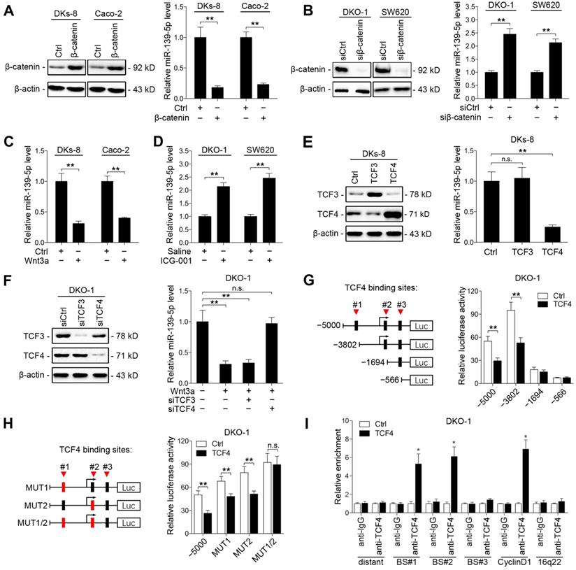 Wnt/β-catenin signaling transcriptionally represses miR-139-5p in KRAS-mutant CRC cells. (A) Left, immunoblots of β-catenin expression in DKs-8 and Caco-2 cells transfected with β-catenin and control plasmids. Right, miR-139-5p expression detected in the indicated cells by qRT-PCR. (B) Left, immunoblots of β-catenin expression in DKO-1 and SW620 cells transfected with β-catenin siRNA (siβ-catenin) or control siRNA (siCtrl). Right, miR-139-5p expression detected in the indicated cells by qRT-PCR. (C) DKs-8 and Caco-2 cells were treated with Wnt3a (5 ng/mL) or DMSO for 24 h. miR-139-5p expression was detected by qRT-PCR. (D) DKO-1 and SW620 cells were treated with ICG-001 (2 µg/mL) or DMSO for 24 h. miR-139-5p expression was detected by qRT-PCR. (E) DKs-8 cells were transfected with TCF3, TCF4, or control plasmid for 48 h. Immunoblotting was performed to examine the expression of TCF3 and TCF4. miR-139-5p expression was detected by qRT-PCR. (F) DKO-1 cells were transfected with TCF3 siRNA (siTCF3) and TCF4 siRNA (siTCF4) for 48 h. Immunoblotting was performed to examine the expression of TCF3 and TCF4. miR-139-5p expression was detected by qRT-PCR. (G) Left, schematic representation of consecutive deletion constructs spanning the promoter region (-5000 to +1) of MIR139, with the site -2373 nucleotides upstream of MIR139 sequence as the transcription start site [23]. The putative TCF4-binding sites in the miR-139 promoter region are shown in black boxes. Right, luciferase activity in DKO-1 cells transfected with the luciferase vector pGL3 driven by either the WT or deletion promoter. (H) Left, schematic representation of the mutation constructs of the miR-139 promoter. Right, luciferase activity in DKO-1 cells transfected with the luciferase vector pGL3 driven by either the WT or mutant promoter. (I) The ChIP assay demonstrated the direct binding of TCF4 to the miR-139 promoter in DKO-1 cells. qRT-PCR was carried out to quantitate the immunoprecipitated products using primers within the miR-139 promoter. Primers within the cyclin D1 and 16q22 promoters served as the positive and negative controls, respectively. *P< 0.05; **P <0.01; n.s., not significant.