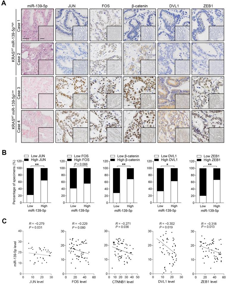 To validate the correlations between miR-139-5p and its targets, we examined the expression of these molecules in the XHDD cohort of 60 CRC patients with and without KRAS mutation (Supplementary Table 1). ISH and IHC revealed that JUN, FOS, DVL1, CTNNB1 and ZEB1 levels were higher in most KRAS-mutant samples in which miR-139-5p expression was reduced or lost than in WT KRAS samples in which miR-139-5p was expressed at relatively high levels (Figure 6A). Spearman correlation analysis revealed that the levels of JUN, DVL1, CTNNB1 and ZEB1 were negatively correlated with those of miR-139-5p, but the correlation between FOS and miR-139-5p did not reach statistical significance (Figure 6B). Similar correlations were observed by qRT-PCR analyses using CRC tissues (Figure 6C). These clinical observations further indicate that miR-139-5p suppresses multiple targets in CRC.
