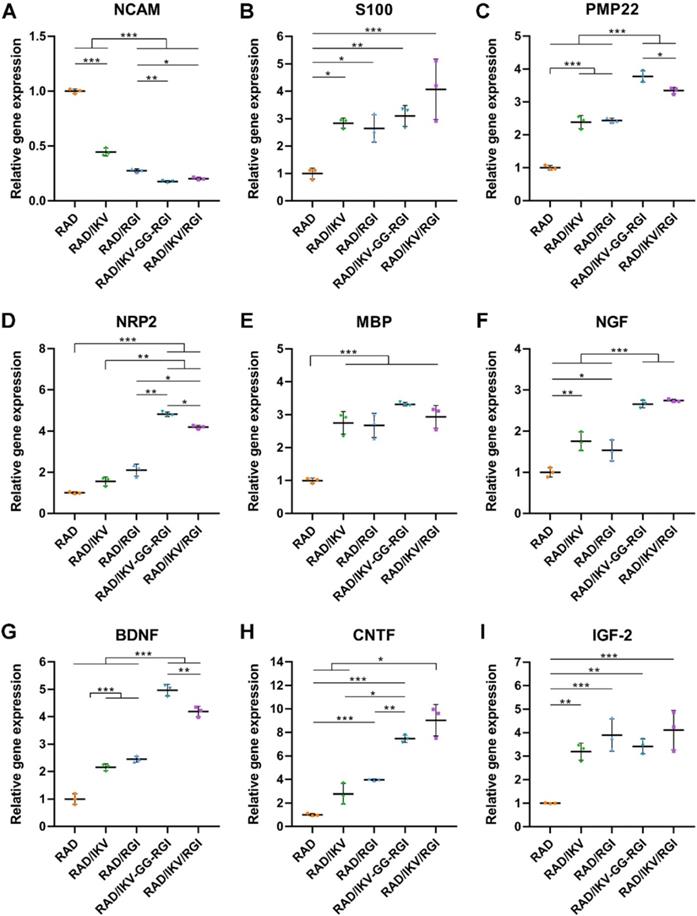 Multiple genes are upregulated or downregulated following PNI, especially in 14 days postoperatively, and reflected the in vivo regenerative process and mechanism [73-75]. Previous studies reported a maximum number of differentially expressed genes at 7-days post-injury. Therefore, we harvested the nerve grafts from each group and evaluated gene expression related to growth factors (NGF, BDNF, and VEGF) and myelination (PMP22, P0, and S100) inside the conduits at 7-days post-operation (Figure 5). Studies showed that NGF and BDNF are very important for the development and regeneration of the nervous system, and they were kept up-regulated after sciatic nerve injury [76]. The expression of growth factors and myelin-related genes were significantly higher in the Autograft group relative to all other groups. Specifically, we found that VEGF expression was similar among the Autograft group and functionalized peptide groups, indicating an improvement in vascularization that could contribute to nerve regeneration. The expression of S100 in groups containing both IKV and RGI was significantly higher than that in groups containing either IKV or RGI hydrogels, suggesting enhanced SC proliferation in vivo. There was no significant difference among functionalized hydrogels in the expression of neurotrophins and myelination genes, but obvious higher means of BDNF expression in RAD/IKV-GG-RGI and RAD/IKV/RGI groups could be seen. The results confirmed the outstanding outcome of autograft in repairing nerve injury. And a trend to approach the Autograft group was obvious in dual-functionalized peptide groups. This may could explain the difference in regeneration between Autograft group and dual-functionalized peptide groups after 12 weeks. Additionally, the cell types and the proportion of each cell type in the lesion side are very important to evaluate the gene expression, such as Schwann cells, macrophage, and neurons [77]. The secretion of NGF and BDNF, and the myelination were considered as the function of SCs. Therefore, here we only discussed the effect of hydrogels on SCs after 7 days, which was similar to previous study [78]. However, more investigation about the relationship between cell types and gene expression in vivo should be carried out.