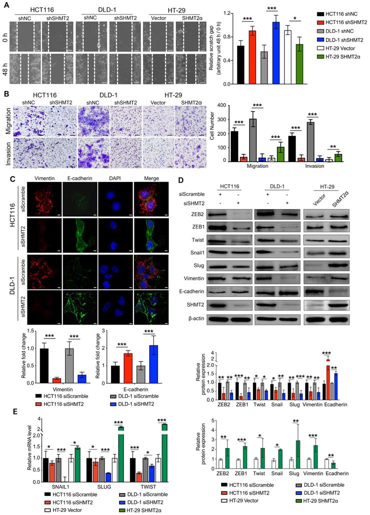 SHMT2 promotes the migration and invasion of CRC cells in vitro. (A) Representative images (left) and quantification (right) of the wound healing assay using CRC cells with SHMT2 knockdown or SHMT2α overexpression (n = 3). Scale bar, 200 μm. * p < 0.05, *** p < 0.001; Student's t-test. (B) Representative images (left) and quantification (right) of the migration and invasion assay using CRC cells with SHMT2 knockdown or SHMT2α overexpression (n = 3). Scale bar, 100 μm. ** p < 0.01, *** p < 0.001; Student's t-test. (C) Representative immunofluorescence images (up) and quantification (down) of vimentin and E-cadherin in CRC cells. Merged images represent overlays of vimentin (red), E-cadherin (green), and nucleus (blue). Scale bar, 5 μm. *** p < 0.001; Student's t-test. (D) Western blot analysis (up) and quantification (down) of vimentin, E-cadherin, and EMT-associated transcription factors in CRC cells after SHMT2 knockdown or SHMT2α overexpression. * p < 0.05, ** p < 0.01, *** p < 0.001; Student's t-test. (E) RT-qPCR analysis of EMT-associated transcription factors in CRC cells after SHMT2 knockdown or SHMT2α overexpression (n = 3). * p < 0.05, *** p < 0.001; Student's t-test. The data are presented as the mean ± SD from at least three independent experiments. The error bars show the SD.