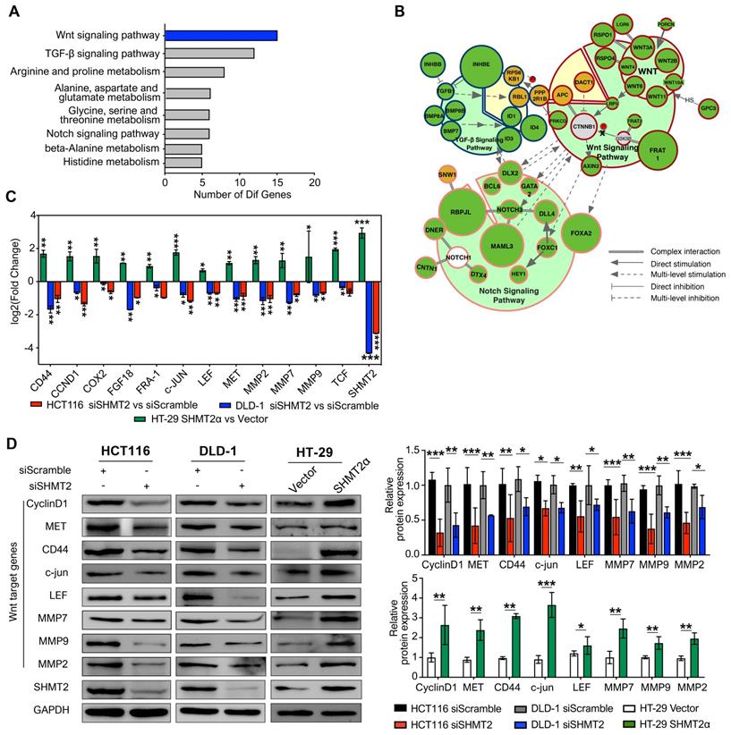 To gain insight into the mechanism by which SHMT2 regulates proliferation and migration in CRC cells, we applied mRNA sequencing technology to explore the factors regulated by SHMT2. The results showed that SHMT2 knockdown profoundly altered the expression of almost 200 genes in HCT116 cells (Figure S4A-B). According to the Gene Ontology (GO) Consortium, SHMT2 knockdown clearly suppressed multiple signaling pathways, including the TGF-β, Notch, and Wnt pathways, which are closely related to CRC progression (Figure 3A). Among them, the number of genes that changed in the Wnt signaling pathway was the largest (Figure 3A, Table S1). Furthermore, cell signaling network analysis of these significantly altered genes revealed that Wnt/β-catenin signaling was critical in these pathways and closely connected with the TGF-β and Notch pathways (Figure 3B). Importantly, mRNA-seq assays showed that SHMT2 knockdown decreased the mRNA levels of multiple target genes of the Wnt/β-catenin pathway, such as c-Myc, CD44, ID2, L1CAM, and RUNX2. We then performed RT-qPCR assays to verify the representative genes obtained from the mRNA-seq results. The expression of the oncogenes c-Myc and CCND1, which are closely involved in the Wnt/β-catenin pathway, was decreased along with SHMT2 knockdown. Simultaneously, the tumor-suppressor genes p21, PTEN, and TGFBR2 were upregulated (Figure S4C).