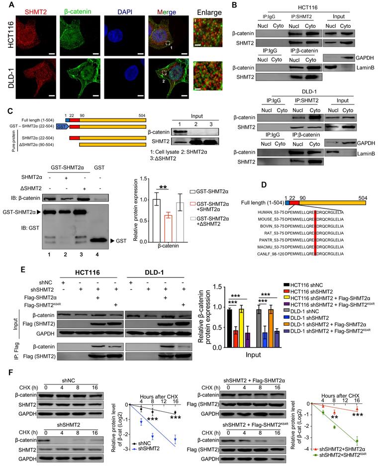 SHMT2 interacts with β-catenin at K64. (A) Representative immunofluorescence images of SHMT2 (blue) and β-catenin (red) in HCT116 and DLD-1 cells. Scale bars, 5 μm, 1 μm. (B) The cytoplasmic and nuclear protein was separated from HCT116 and DLD-1 cells and subjected to immunoprecipitation using the indicated antibodies. (C) Pure SHMT2 protein with the different indicated constructions were added into the cell lysates derived from HCT116 cells. Immunoblot analysis of GST pull-down using the indicated antibodies. The relative β-catenin expression (normalized to GST-SHMT2α) was quantified. ** p < 0.01; Student's t-test. (D) The alignment of SHMT2 for human, mouse, bovin, rat, pantr, macmu, and canlf, shows highly conserved residues in SHMT2, including lysine 64. (E) Stable SHMT2 knockdown HCT116 and DLD-1 cells that re-expressed the shRNA-resistant SHMT2α or K64R mutation were constructed. The cells were subjected to immunoprecipitation using the indicated antibodies. (F) Western blot analysis (left) and quantification (right) of β-catenin in HCT116 cells with stable SHMT2 knockdown that re-expressed shRNA-resistant SHMT2α or K64R mutation after cycloheximide (CHX) treatment at different time points. ** p < 0.01, *** p < 0.001; Student's t-test. The data are presented as the mean ± SD from at least three independent experiments. The error bars show the SD.