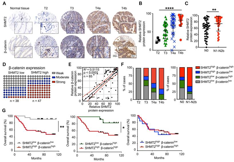 To explore the clinical significance and correlation of SHMT2 and β-catenin in CRC, immunohistochemistry (IHC) analysis was used to validate the expression of SHMT2 and β-catenin by using a CRC tissue array that contained 85 human CRC tissues and corresponding normal adjacent tissues (NATs) (the clinical characteristics of patients are provided in Table S2). The expression of SHMT2 in CRC tissues was found to be higher than that in NATs (Figure 8A), which is consistent with Gene Expression Omnibus (GEO) data (Figure S8A). Regarding the SHMT2 IHC data, 58 cases (65%) exhibited strong immunopositivity, 18 cases (21%) exhibited moderate immunopositivity, and 12 cases (14%) exhibited no or weak immunopositivity in tumor tissues (Figure S8B). In contrast, most normal tissues (92%) exhibited no or weak SHMT2 expression (Figure S8B). The expression of SHMT2 in CRC tissues was associated with advanced T stage (P < 0.001) (Figure 8B) and lymph node metastasis (P = 0.007) (Figure 8C). β-catenin overexpression was more prominent in CRC tissues than in NATs (Figures 8A and S8B), consistent with a previous study [23]. We then analyzed the potential correlation between SHMT2 and β-catenin based on the IHC data. The results showed that CRC tissues with high SHMT2 expression tended to have higher β-catenin levels, and the protein expression of SHMT2 was closely associated with that of β-catenin (R2 = 0.5115, P < 0.0001) (Figure 8D-E). Statistical analysis showed that among patients with higher SHMT2 expression, β-catenin was expressed more strongly in the nucleus (Figure S8C-D), suggesting that the upregulated β-catenin induced by SHMT2 mainly translocated into the nucleus. Furthermore, we examined the correlation between SHMT2 and β-catenin expression with cancer progression and patient survival. An analysis of SHMT2/β-catenin expression and clinicopathologic parameters showed that high SHMT2 and β-catenin expression was significantly associated with an advanced T stage and lymph node metastasis (Figure 8F). Kaplan-Meier survival analysis revealed that the expression of SHMT2 in CRC tissues was negatively correlated with the patient survival rate (Figure S8E). Notably, patients with high SHMT2 and high β-catenin expression exhibited a significantly poorer survival rate than patients with low SHMT2 and low β-catenin expression (Figure 8G). Moreover, the effect of SHMT2 on the patient survival rate was more dominant, given that the survival rate was not different between patients with high and low β-catenin expression when the SHMT2 expression was high (Figure 8G). Taken together, these results strongly suggest that the expression of SHMT2 and β-catenin is elevated in human CRC tissues and is tightly linked to CRC progression and metastasis.